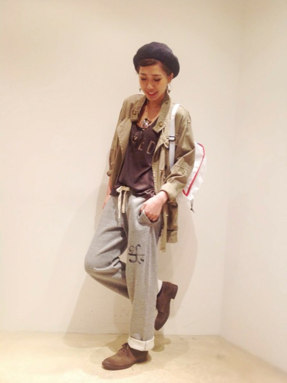GFS(ジーエフエス)のスウェットパンツを Crrent Elliott(カレントエリオット)のTシャツとミリタリージャケットでリラックスカジュアルに...✡ スウェットパンツはストレートのラインが脚を長く見せてくれますよ♪♪
