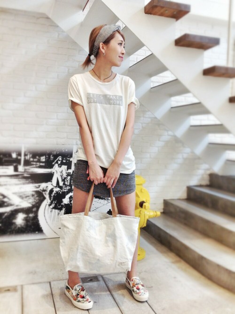 good hyYOUman(グッドヒューマン)のロゴTシャツは袖をロールUPしてヘルシーに着るのがおすすめ♫ Caie(カイエ)の裏毛スカートにD.A.T.E.(デイト)のスリッポンでカラーを入れました**