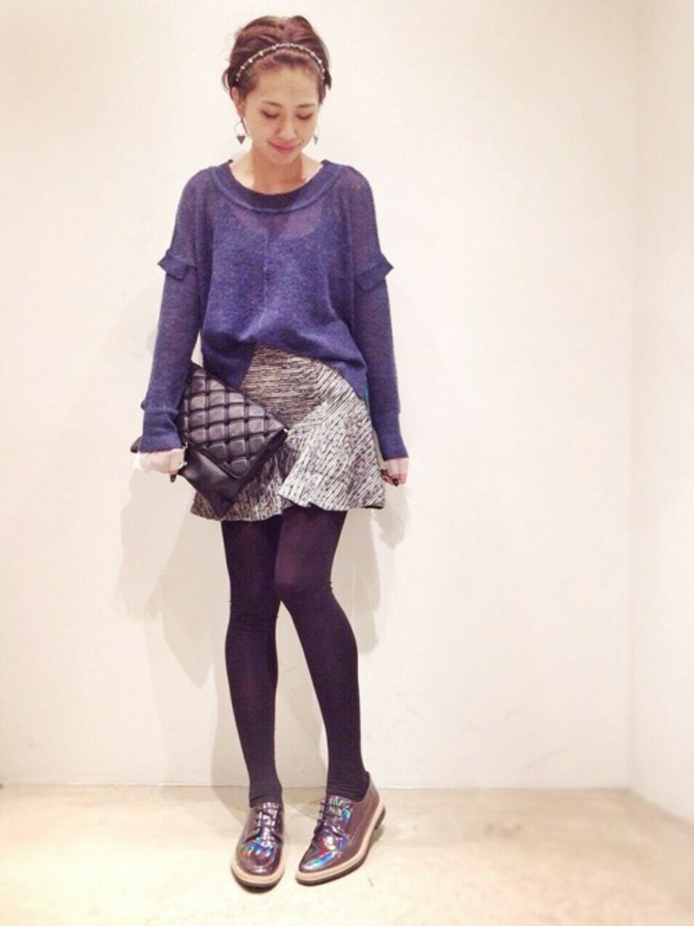 さりげなく袖にチュールが付いているcaie(カイエ)のニットを、FUNKTIONAL(ファンクショナル)のツイードスカートで合わせてガーリーに♡ 今年注目度のDEEPA GURNANI(ディーパグルナニ)のヘッドアクセとDEUX LUX(デュラックス)のバッグでさらに女子度UP☆‼︎
