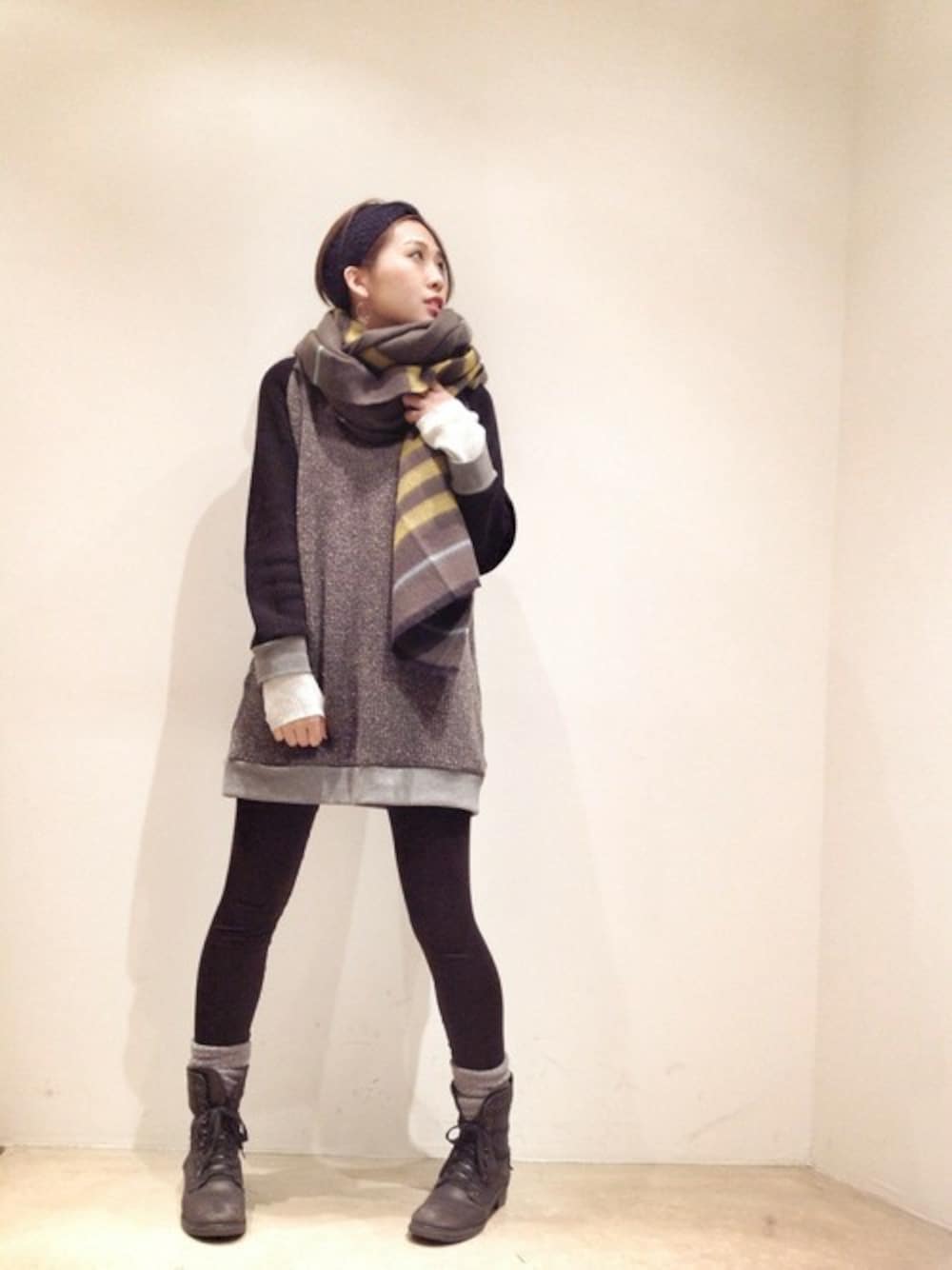 Gray×Blackの配色カラーがおしゃれなCaie(カイエ)のラグランニットワンピース♡♥︎ OLD BETTY'S(オールドベティーズ)のボーダーストールも合わせてGrayに...*