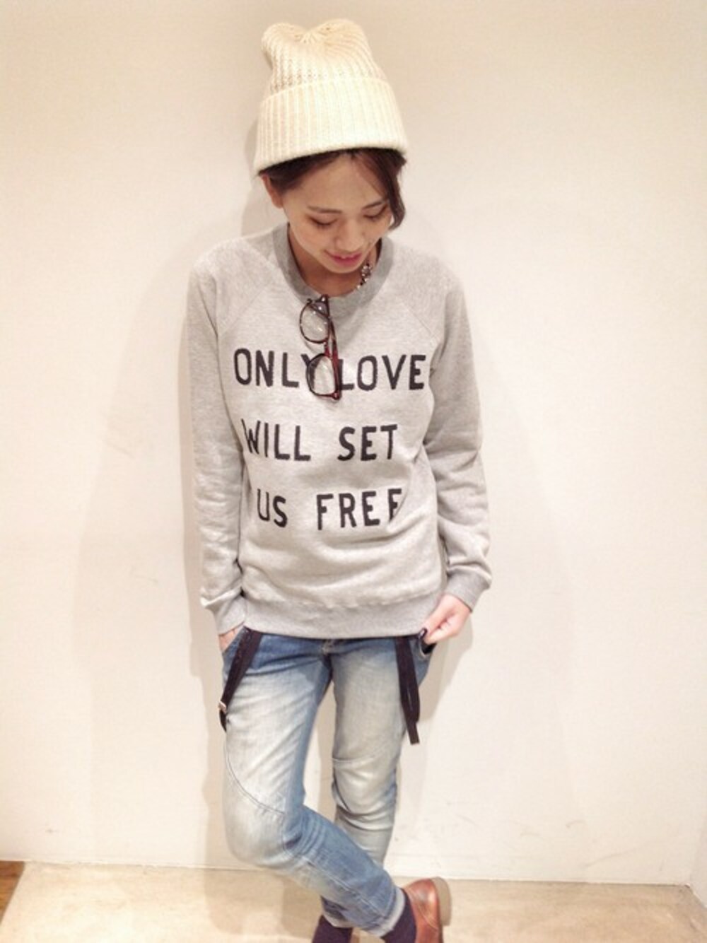 hama(CANALJEAN 神戸店)のスウェット「Caie ロゴ丸首トレーナー/カイエ」を使ったコーディネート