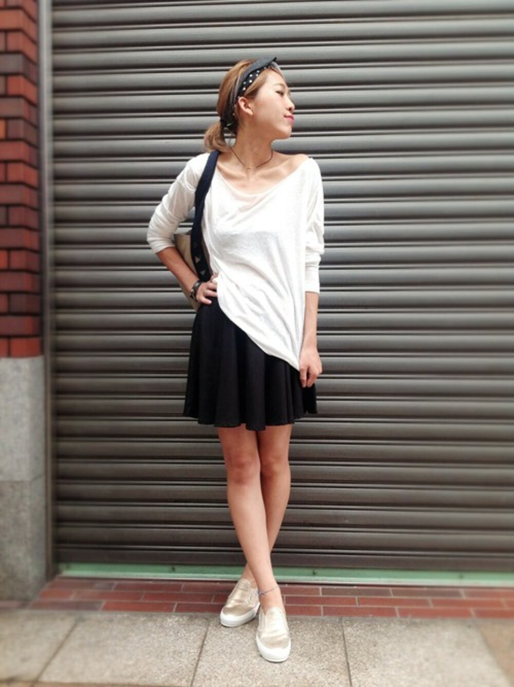 V::ROOMのカットソーをルーズにlagoonのサーキュラースカートとコーディネート*** 足元は商品名: EXTRA XIII(エクストラナイツ)のレザースリッポンのプラチナムカラーをchoice☆ 少し秋を先取りしたstyleに…♥︎