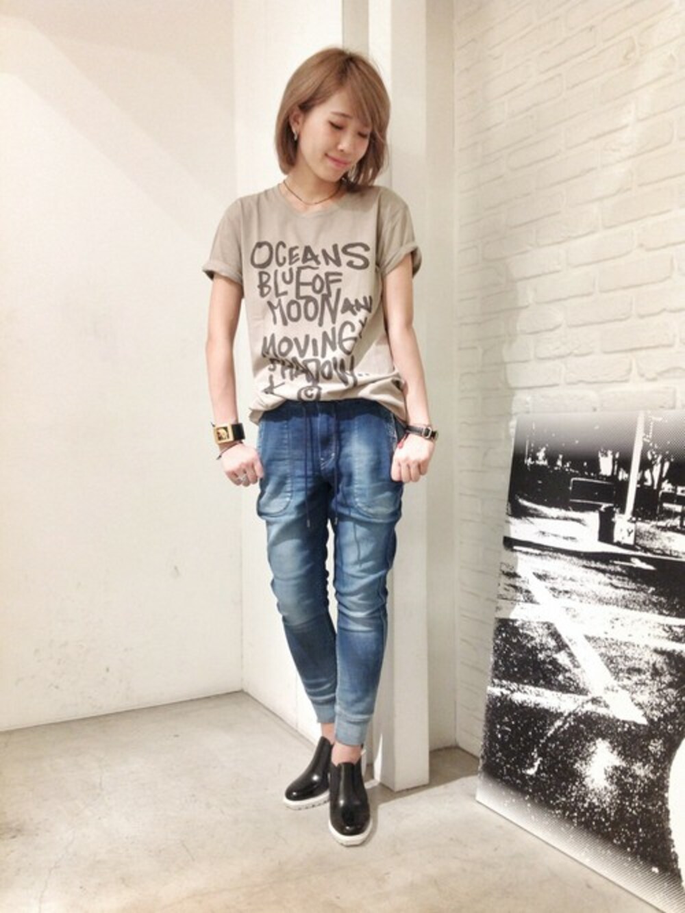 ラフなロゴがお気に入りのcaieのTシャツ❤︎ 落ち着いたベージュカラーで秋にも使えること間違いナシ‼︎ YANUKのパンツは人気のデニットシリーズ♬