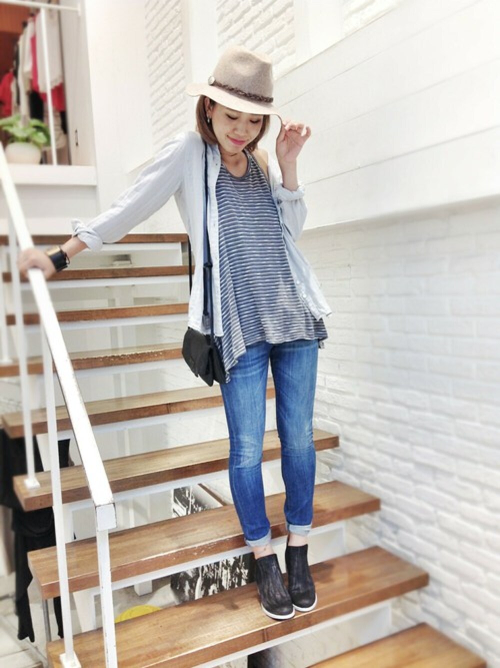 YANUKのシャツからNEWカラーのグレーが登場♬ 重たいいろあいになりがちな秋冬のコーデを爽やかに見せてくれる1枚** インナーにボーダーを覗かせてカジュアルに♡ Mollini(モリー二)のショートブーツも脚がきれいに見えるのでオススメ!