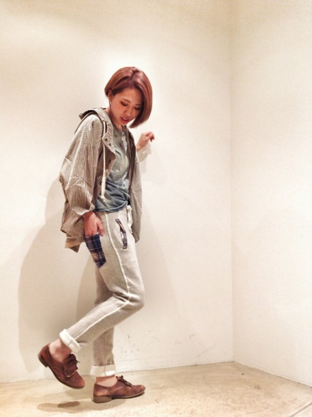 Caie(カイエから)新作のスウェットパンツが入荷しましたっ‼︎ 暖かくて、なんといってもポケットのチェックがちらっと見えるのがcute♬ CURRENT ELLIOTT(カレントエリオット)のTシャツとストライプ柄ジャケットで爽やかに春色を意識しました♥︎**