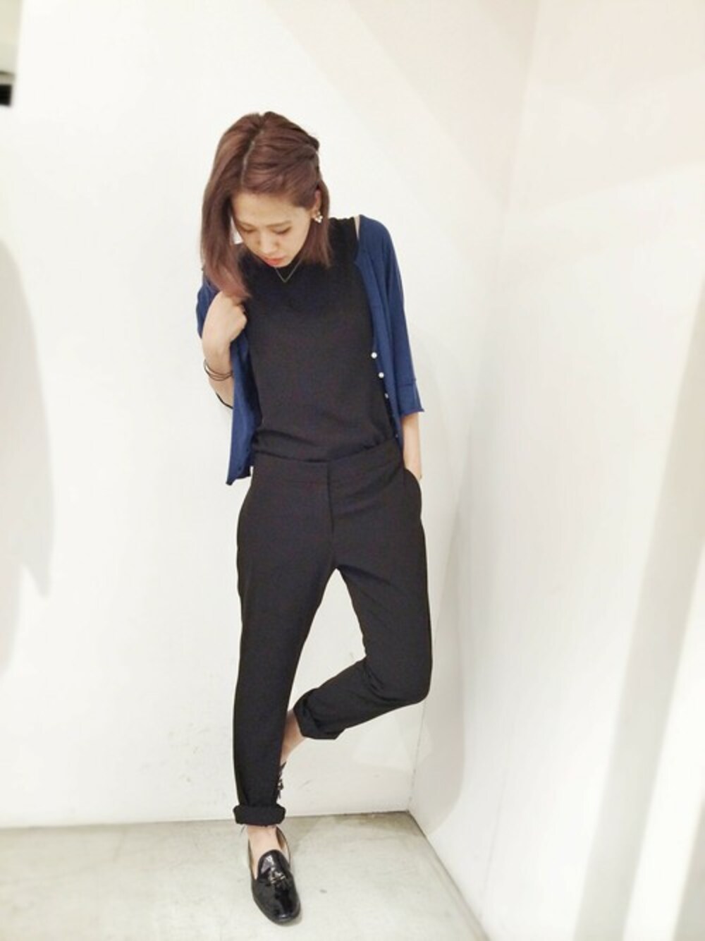 シルエッが綺麗なトcaieのオールインワンは、 前をinしてセットアップ風に着るのが好き** 丈が長すぎないカーディガンを羽織ればバランスよく秋スタイルができます♥︎