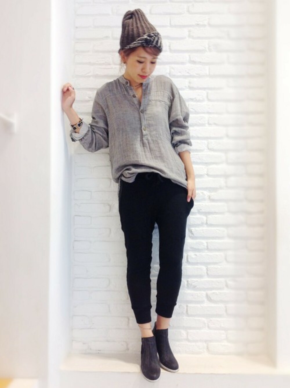 メンズサイズをあえてルーズに切るのがポイントのGypsy05のヘンリーブラウスは、 落ち着いたカラーを活かしてv::roomの裏毛パンツでリラックスコーデに♬