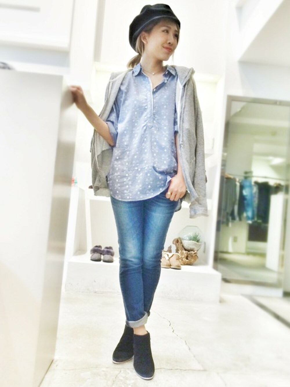 TAMBOURINE(タンバリン)の柄ブラウスは軽い素材感が着やすいっ♥︎ 少し肌寒くなってきたので、Vroom(ブイルーム)のパーカーを羽織りに...**