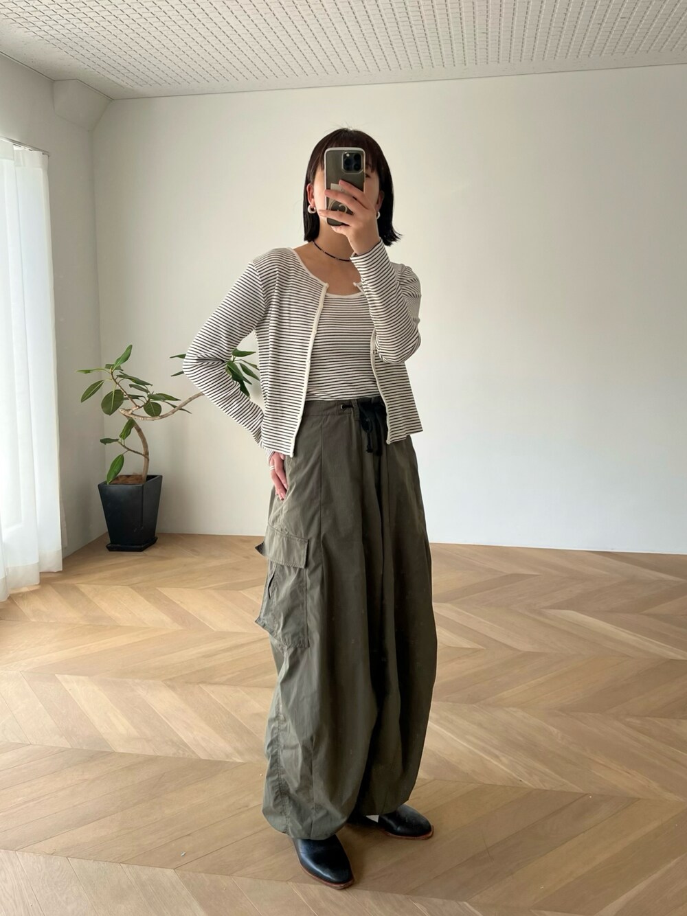 ロングセラーアイテムのカーゴパンツの 春コーデバージョンです♪ 合わせたアンサンブルは キャミとカーディガン別々でも楽しめます♡