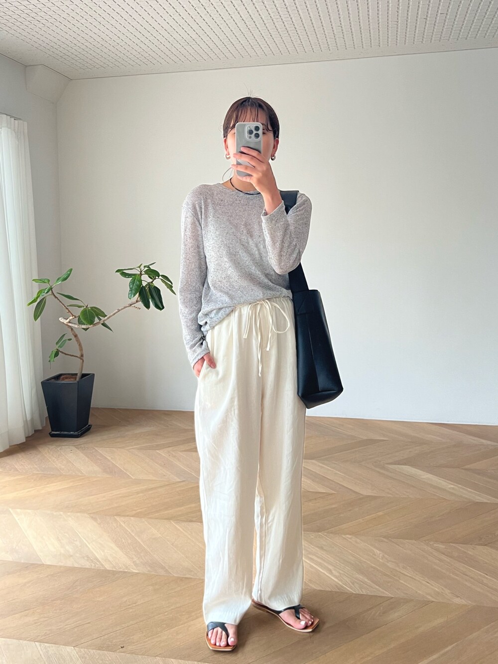 25℃ 梅雨の蒸し暑い日のコーデ☔️ リネン混素材のロンTとパンツで さらっと涼しく、グレー×ホワイトで爽やかに◎