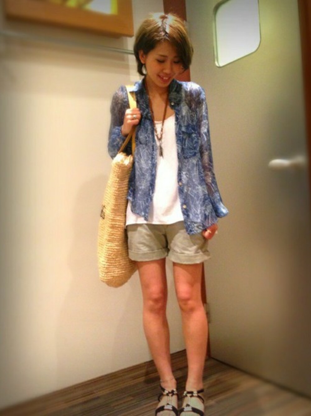 Lagoon(ラグーン)の シフォンの柄シャツは、透け感が大人っぽくてお気に入り♡ 羽織りにも使いやすく、Tシャツの上からpointに◎ 爽やかなブルーは、色んなカラーに合わせやすい♪ グレーッシュカーキの微妙なニュアンスのショートパンツは、ラインも奇麗な40weft(フォーティーウエフト)です。