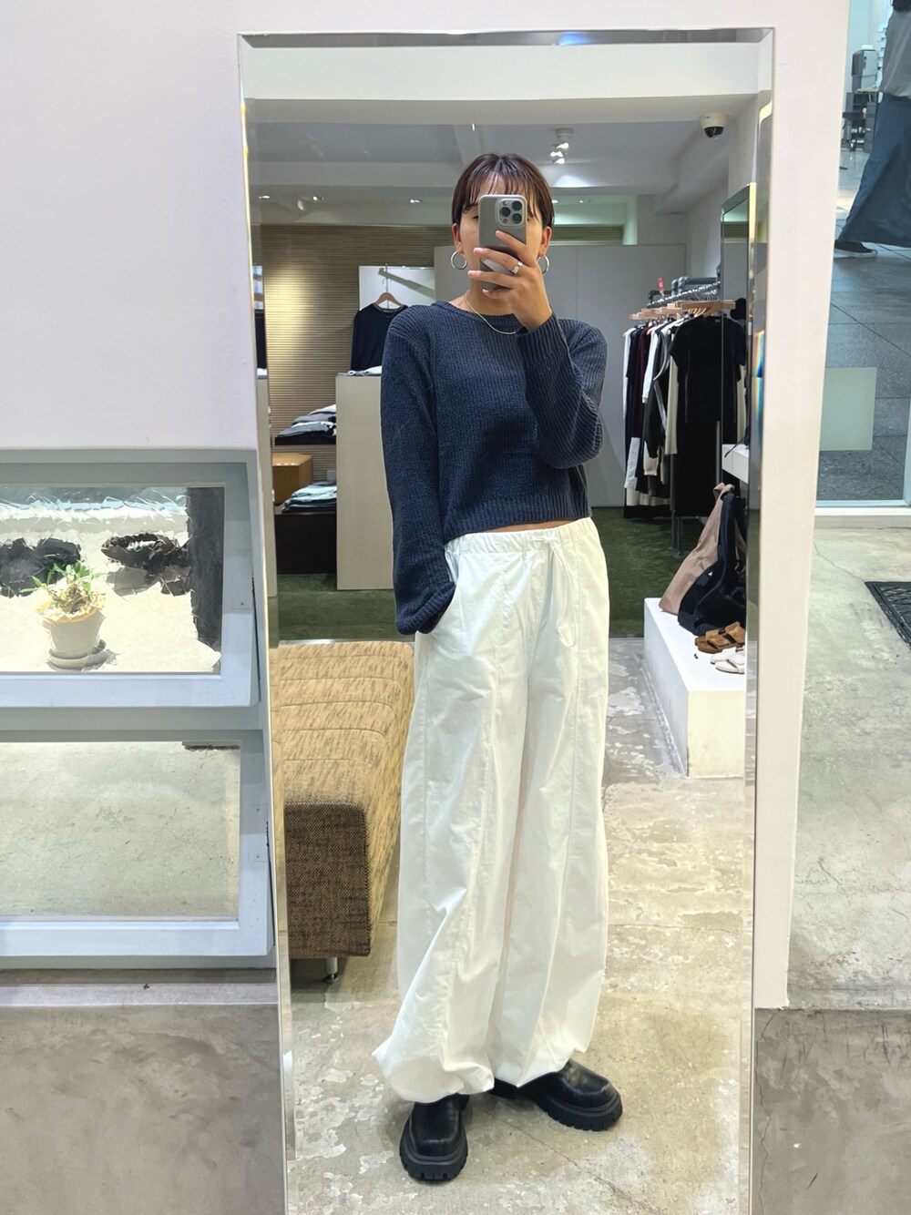 31℃ ドライタッチで今から取り入れることができる秋ニット🧶 ナイロンパンツで爽やかさをプラスして 暑苦しく見えないようにしました◎