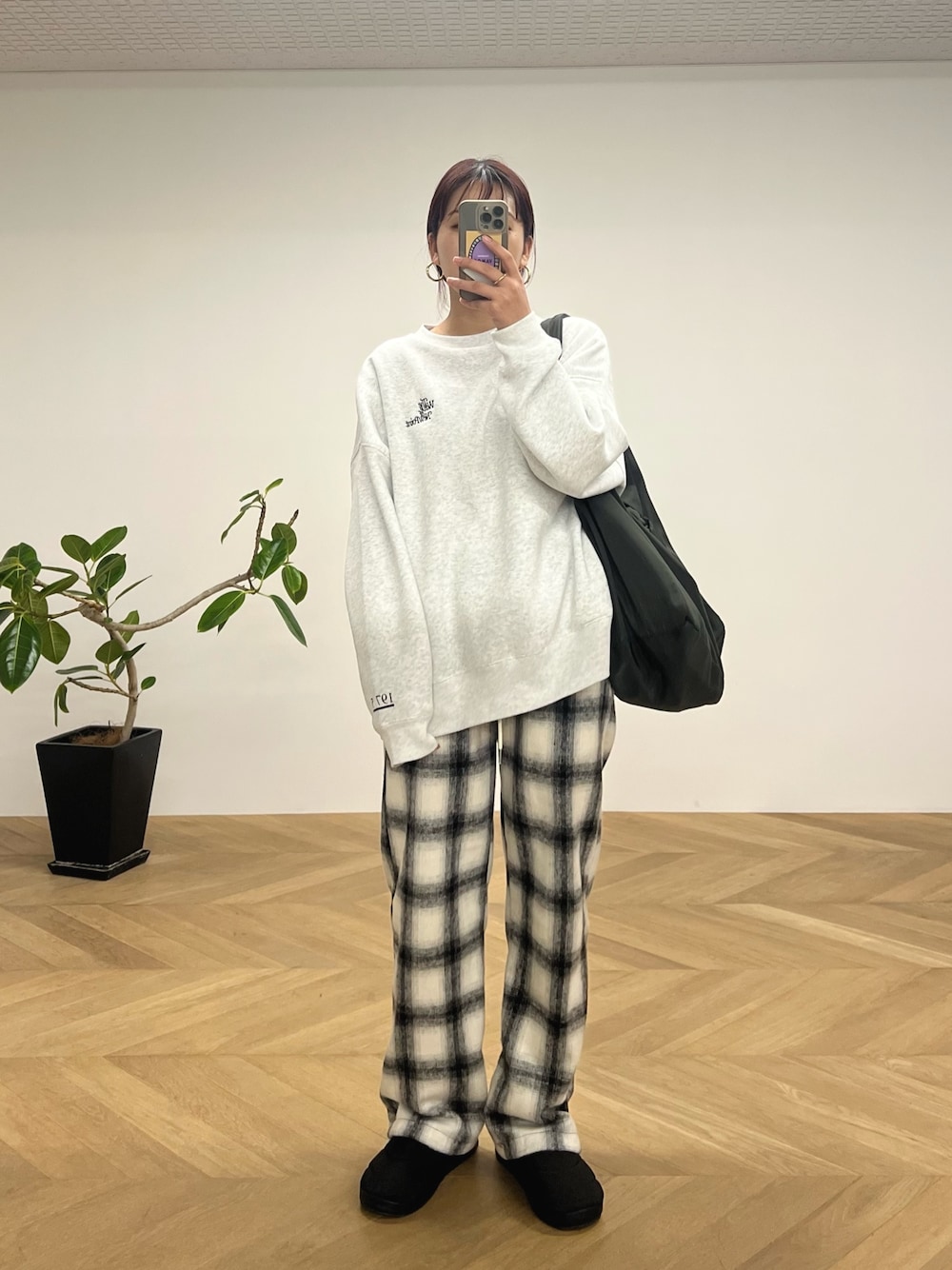 冬のコーデのポイントになってくれるチェックパンツ❄️ ウエストがゴムで楽におしゃれができます◎ この日はスウェットとモックシューズを合わせてよりラフな感じに👍🏼