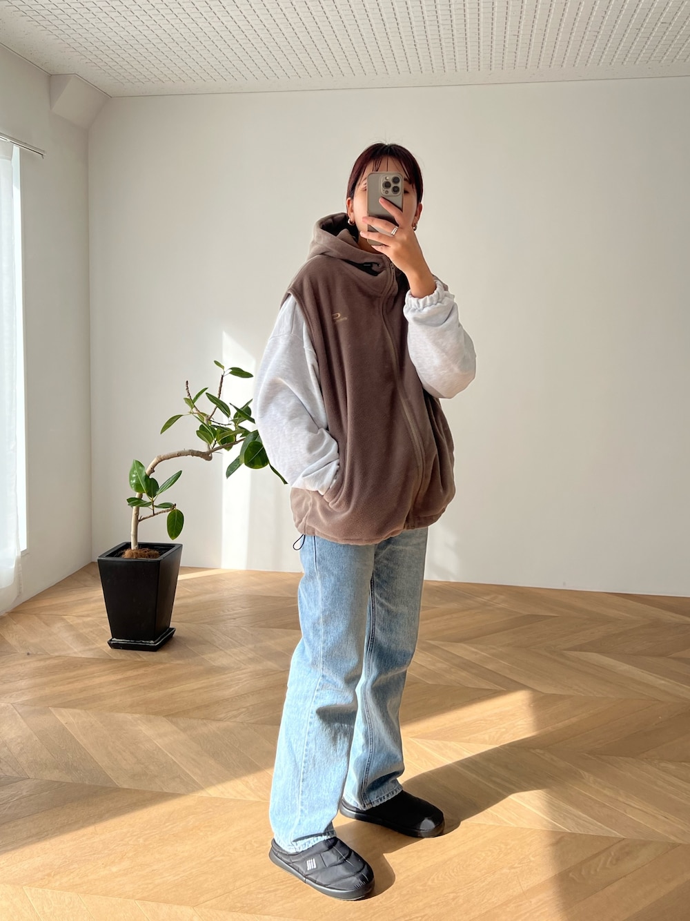 フリース素材の暖かいベストは オーバーサイズなのでインナーに スウェットも楽々着れます◎◎ この日はデニムとモックシューズでラフに♪