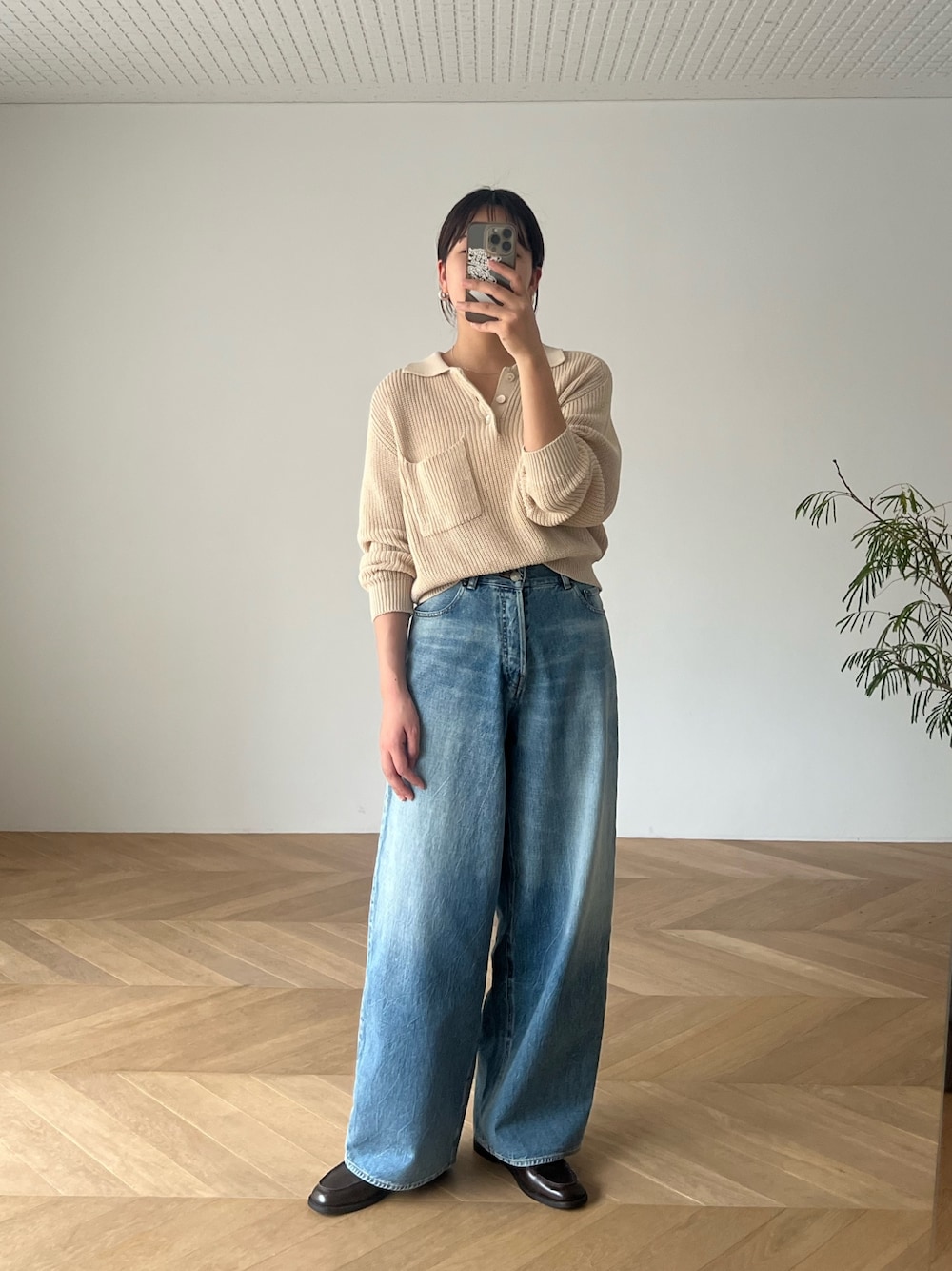 温度調整が難しいこの時期に 1枚で過ごせる便利な春ニット🌼 YAYAのワイドデニムとローファーで大人カジュアルな感じに。