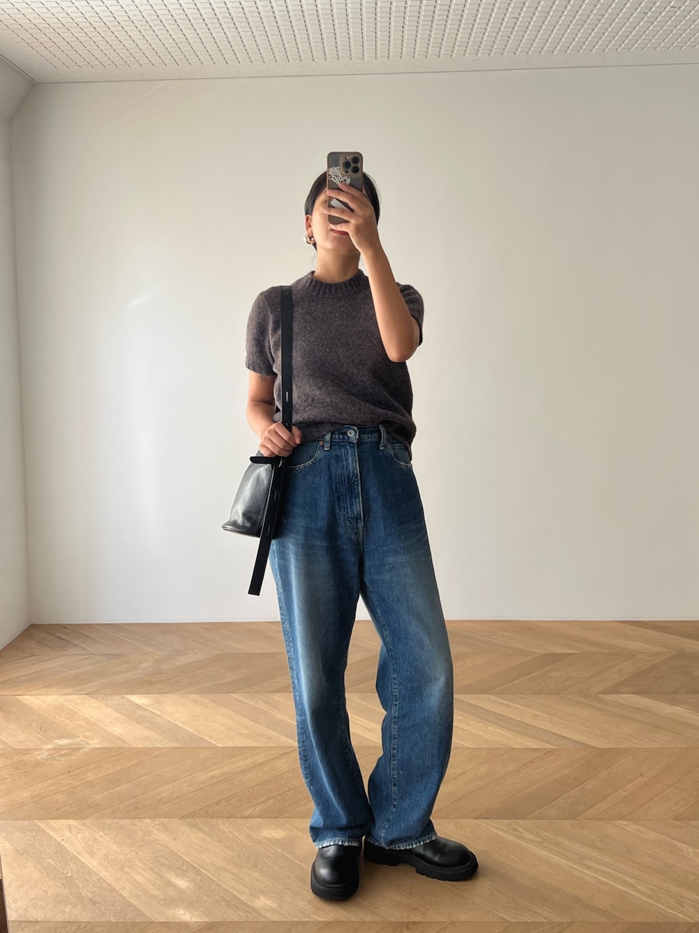 Elmarのニットは半袖なので 秋1番に使えるアイテム🍂 チクチクせず素肌でも安心して着れます♪ 164cmで肩幅がしっかりある体型ですが、 ちょうど良いサイズ感です◎