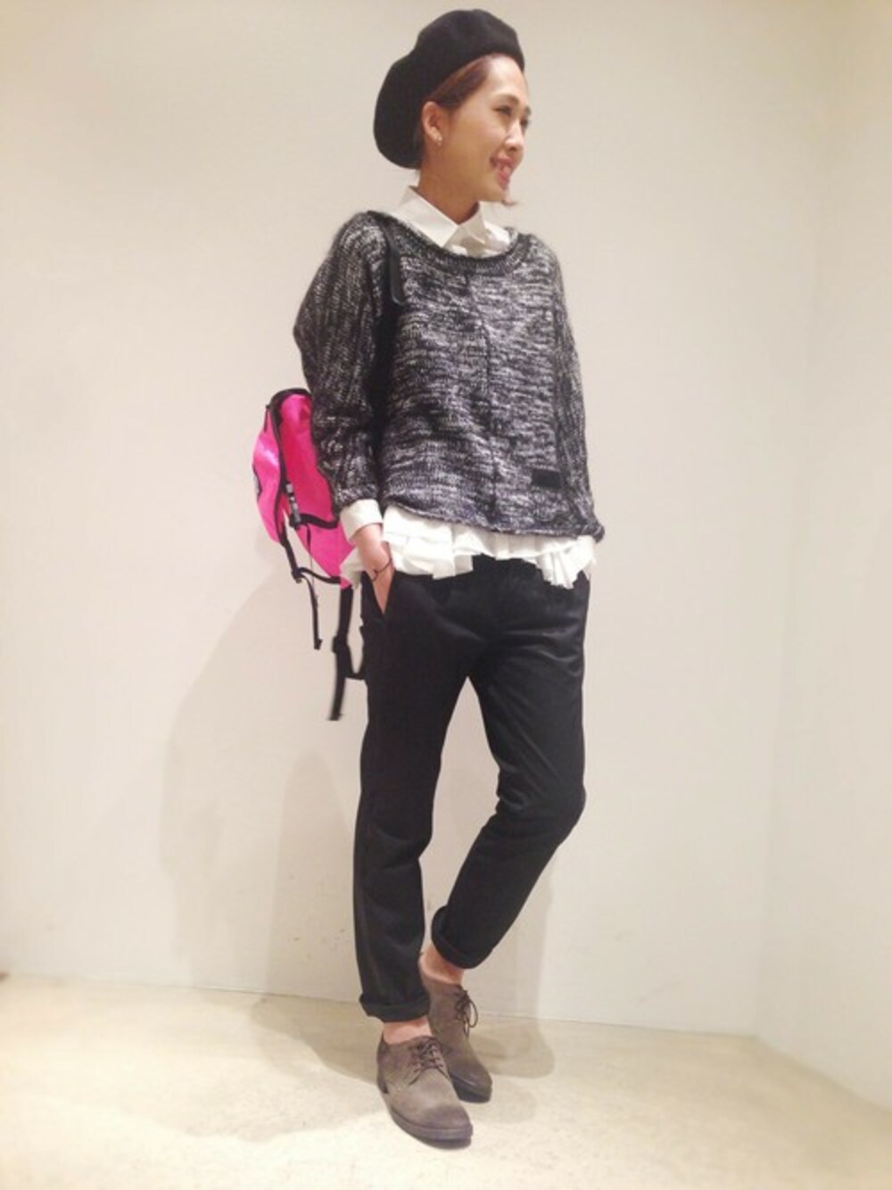 caie(カイエ)のミックスニットはモヘアが入っているので、まだまだ寒いこの時期にオススメ* 丈が長すぎないので、中にシャツをINして裾から見せると可愛いですよ♡ パンツや小物はブラックを使ってモードな雰囲気に...