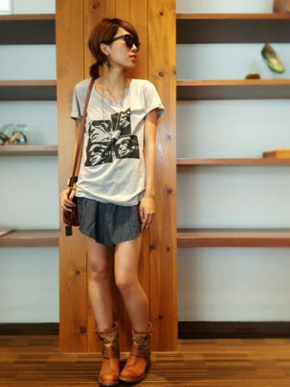 グラフィックプリントが、クールな印象のCaie(カイエ)のプリントTシャツを コンビネゾンの上にレイヤードしてアレンジ* 少しルーズめのサイジングが、抜け感を演出してくれて、幅広いコーディネートに活躍してくれます◎