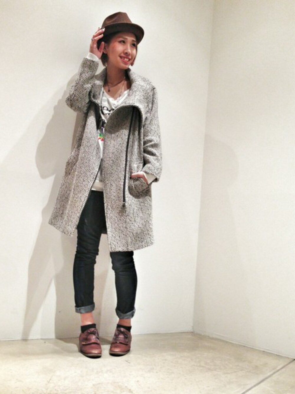 ネップ素材がpointのMunich(ミューニック)のジップアップコート* 長過ぎず、短すぎないベーシックな着丈が合わせやすくて◎ 綺麗めにもカジュアルにもまとまるので、TPOに合わせて使い分けれそうです✡ 淡いカラーでまとめて、Chiristy'S(クリスティーズ)のブラウンのHATでシャープさをプラス+