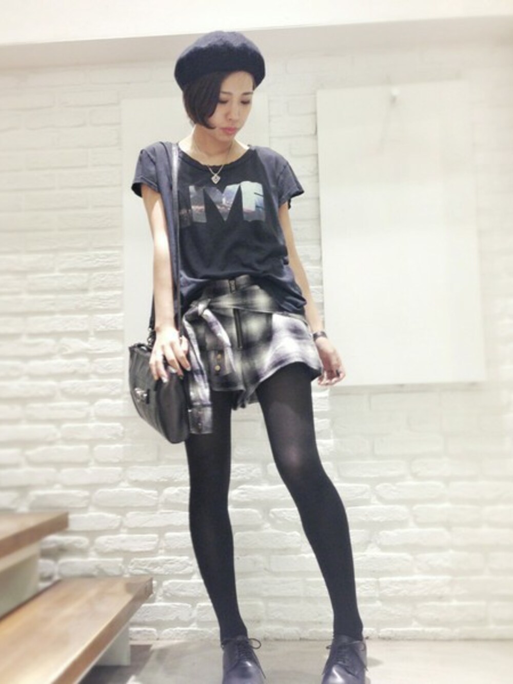 '' LIVE'' のCOOLなプリントが光るCurrent Elliott(カレントエリオット)のTシャツ* は、素材の柔らかさと程よくゆるめなサイズ感にひかれました◎ チェックアクセントにブラックでまとめた大人秋コーデです* ルーズなTシャツは、フロント部分だけさりげなくボトムにインするとスッキリとみえます♡