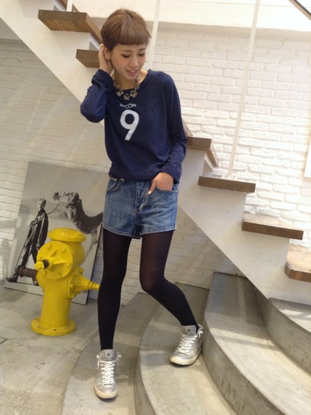 ナンバリングプリントがさりげなく可愛いCaie(カイエ)のロンTをボーイッシュにOneteaspoon(ワンティースプーン)のショートパンツと☆☆ ショートパンツは脚がすっきり見える形が嬉しい1枚☻ 夏に素足で履いてもきれいですよ♪