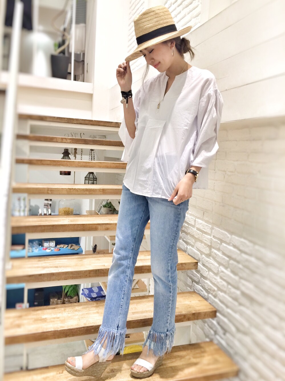 TODAYFULのフレアブラウスはデニムと相性抜群っ♬ ノーカラーなのですっきり着れます🌿💕