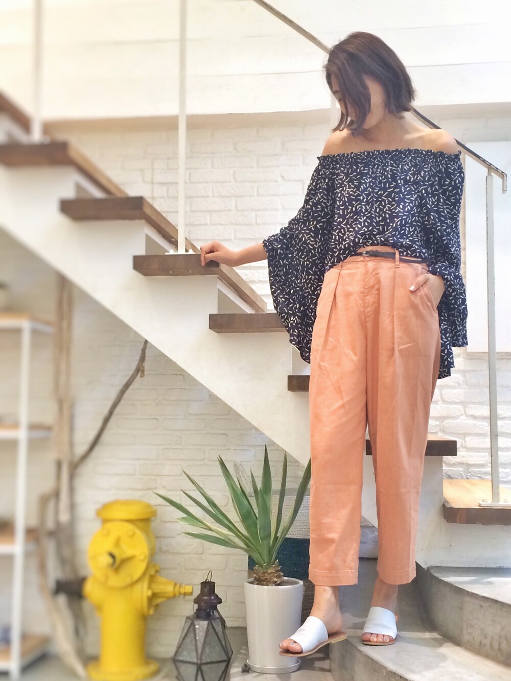 YANUKのワイドパンツは暑い日でも涼しく履けるっ🌺 オレンジカラーも合わせやすくてお気に入り🤗