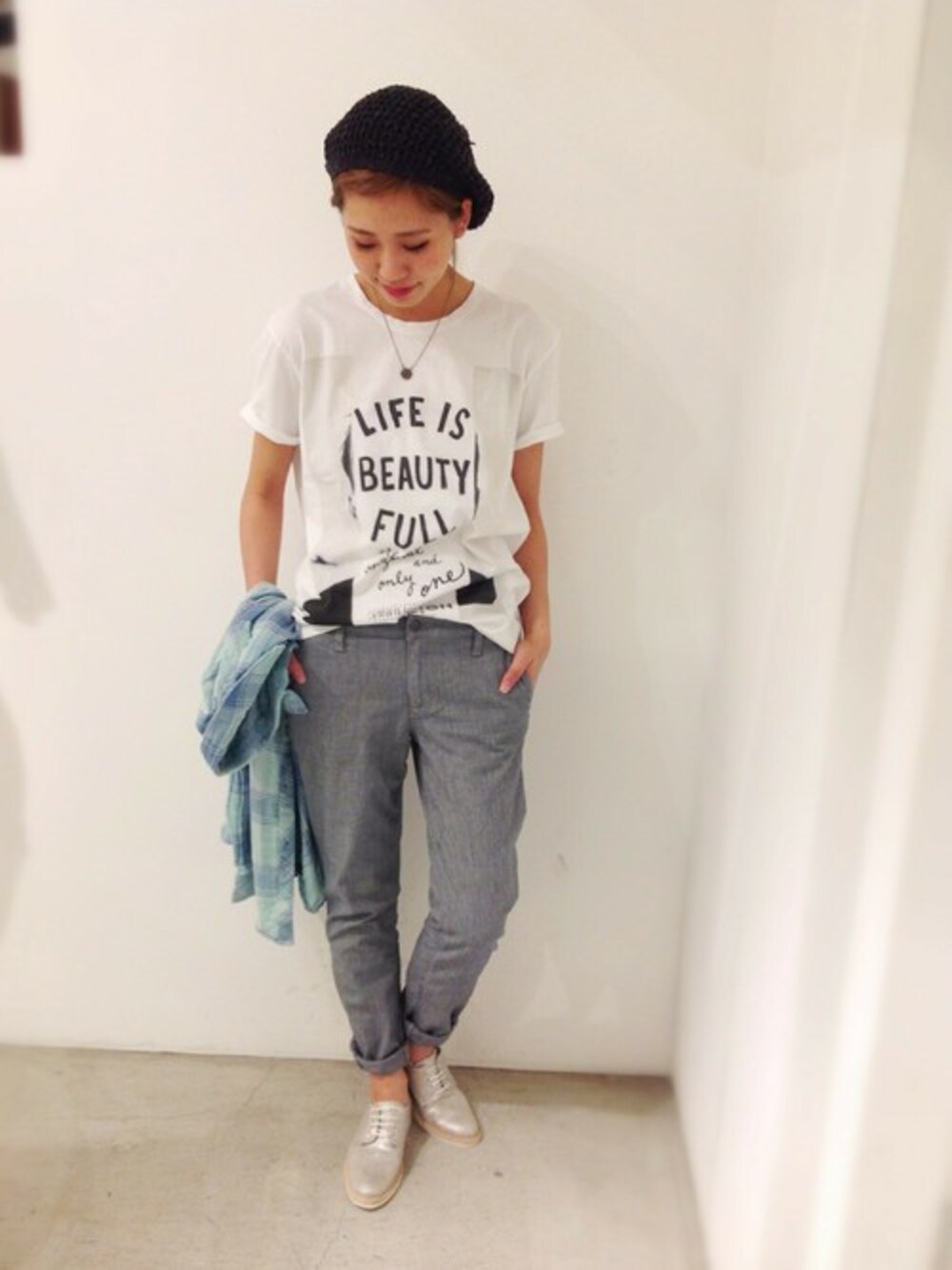 hama(CANALJEAN 神戸店)のTシャツ/カットソー「REIGN ロゴプリントTシャツ(LIFE IS BEAUTIFUL) /レイン」を使ったコーディネート