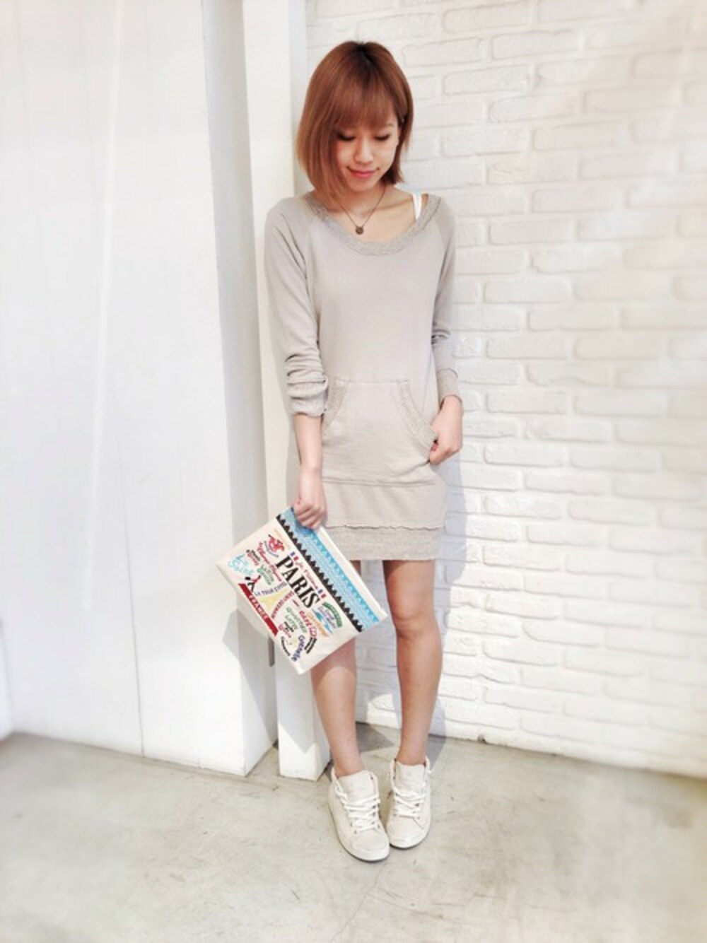 caie(カイエ)のワンピースは軽い着心地で、1枚でシンプルに着てもサマになるっ♫ LEATHER CROWN(レザークラウン)のスニーカーを履けばカジュアルダウンして露出も気にならないですよ☆ アクセントにLiberty Bell(リバティーベル)のクラッチを♡