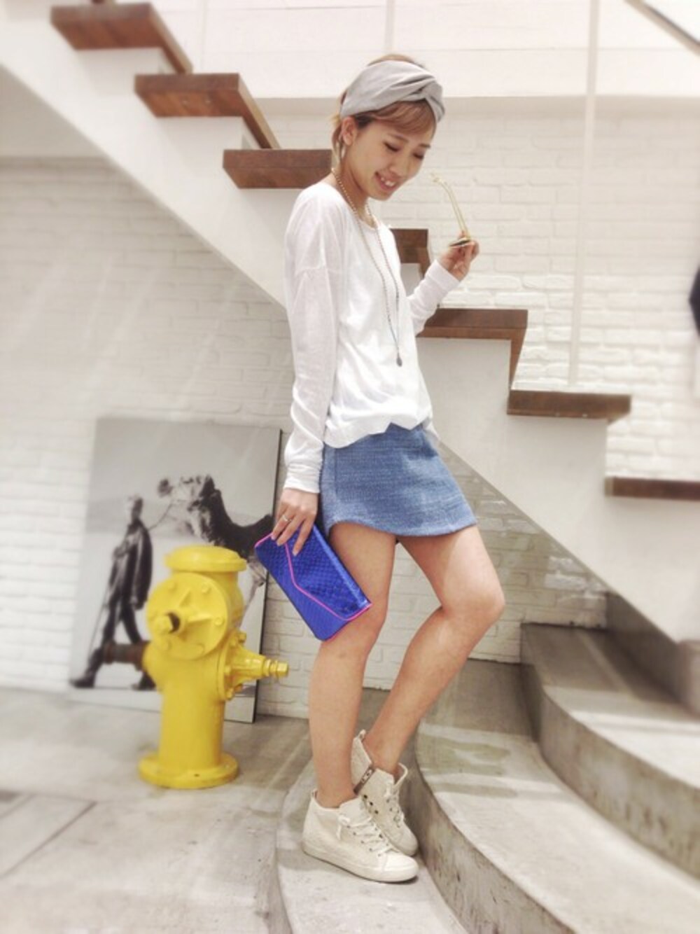 Caie(カイエ)のスカートをメインにコーディネート♡ 鮮やかなカラーがポイントなので、 トップスはシンプルなV::ROOM(ブイルーム)をチョイス♪