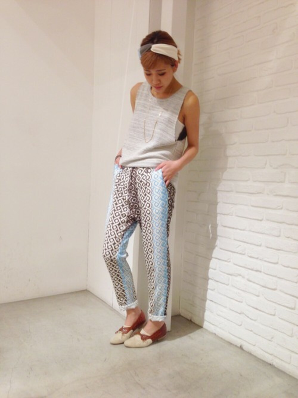 Caie(カイエ)の裏毛タンクは1枚で着ても良し、インナーに使っても良しのスグレモノ♥︎* November(ノーベンバー)の柄パンツにさらっと合わせるだけでこなれ感を出してくれますよ♪ お気に入りのF(エフ)のヘアバンドもさりげなくポイントに...