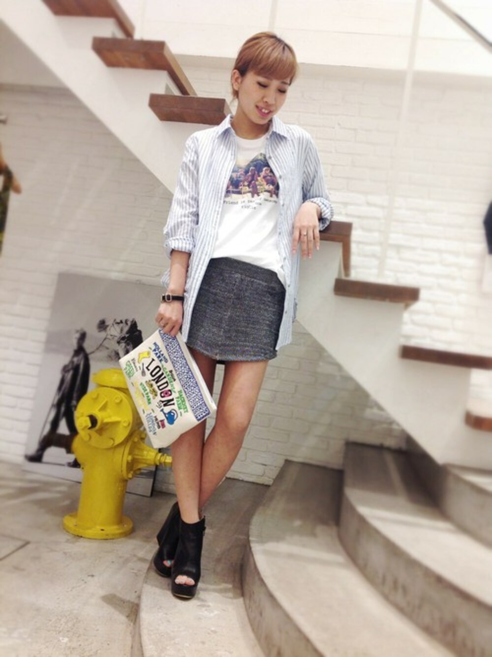 着回しNo.1アイテム caieのスウェットスカート+ストライプシャツで、夏間近の爽やかコーディネート*