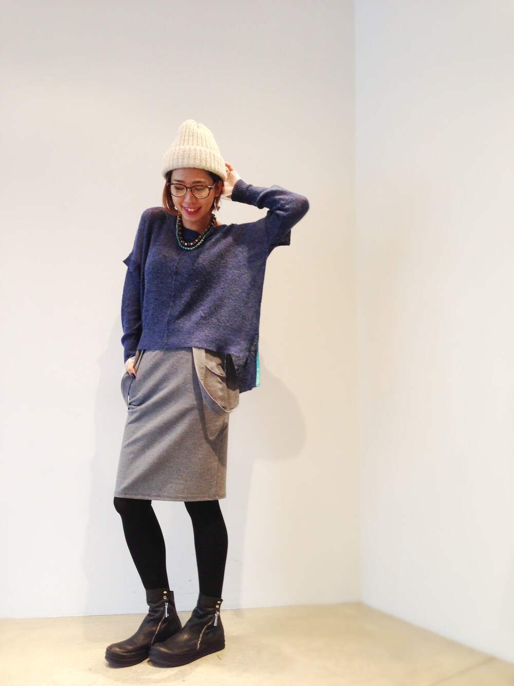 ネイビーとグレーのカラーリングで爽やかにコーディネート* Caie(カイエ)のitemは、細やかなこだわりのあるデザインがお気に入り♡ スカートのサスペンダーをあえて垂らしてカジュアルupがpoint◎
