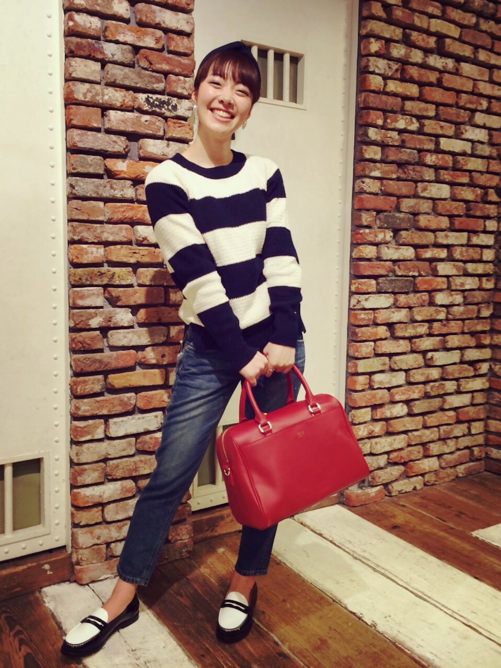 デニムに真っ赤なバッグを持つ♫ オンナです!