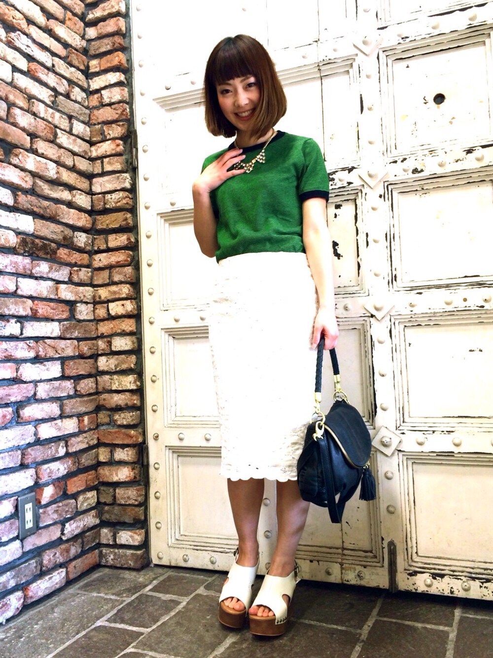 ニット(FREAK'S STORE) サンダル(FREAK'S STORE) ネックレス(FREAK'S STORE) 緑色と大振りのネックレスをレーススカートでちょっと甘さと女性らしさを足しました。 この、タイトスカートのラインが綺麗すぎるー!