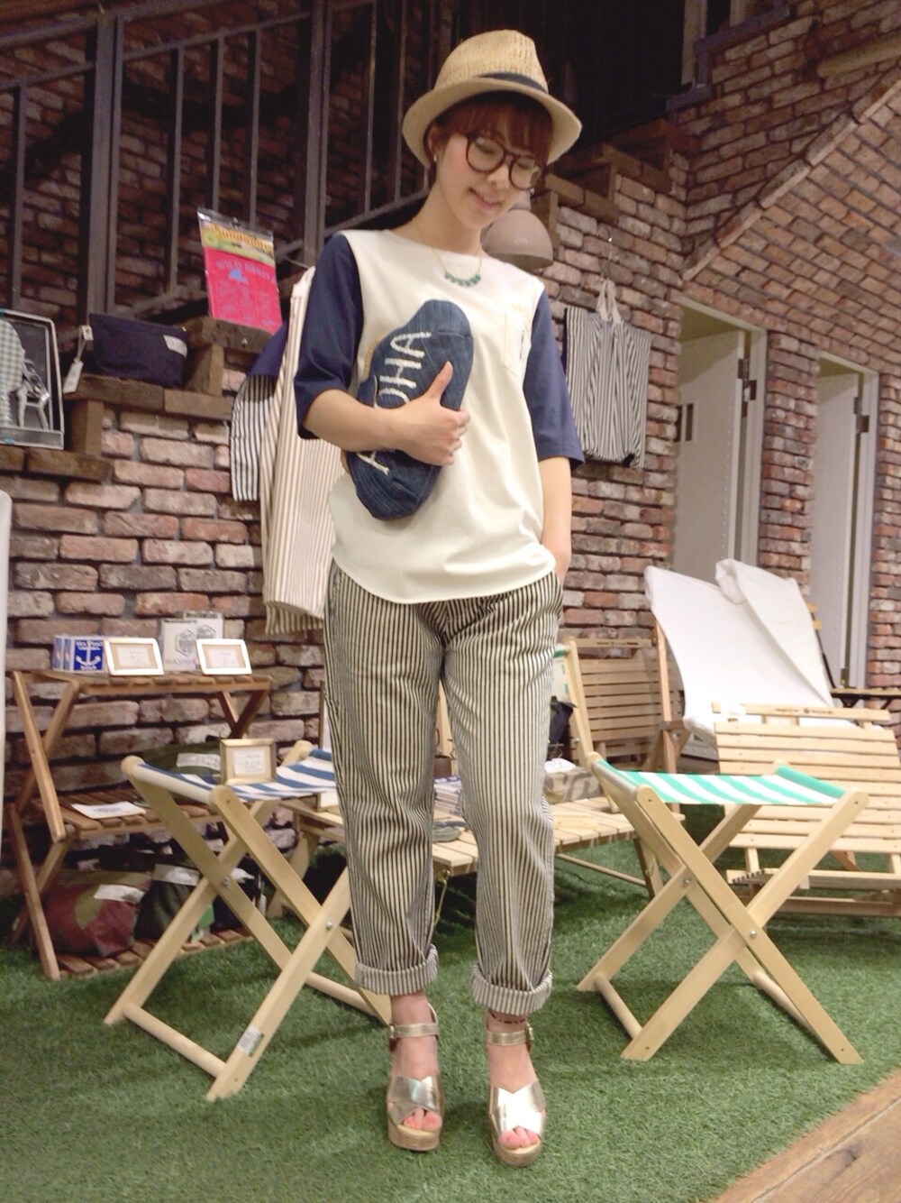 ヒッコリーパンツとロンTの定番カジュアルスタイルには、キラキラのサンダルがポイントです🎵 ロンTにはポケットのところに可愛らしいプリントが。。💓