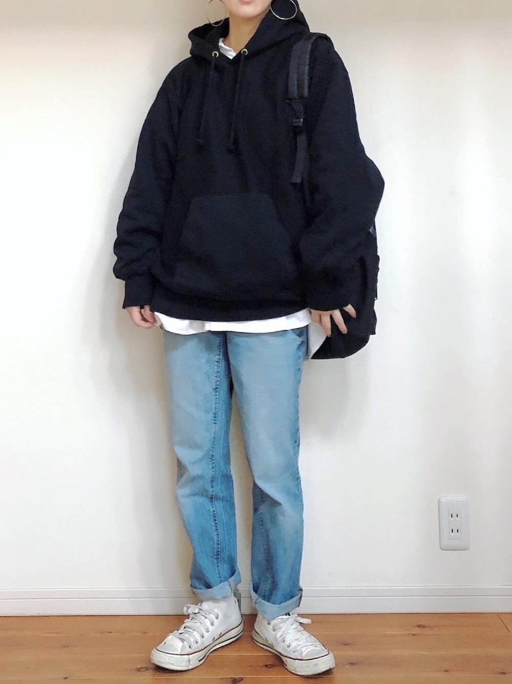 スウェットとデニムでシンプル。 白シャツレイヤードで今どき感😎