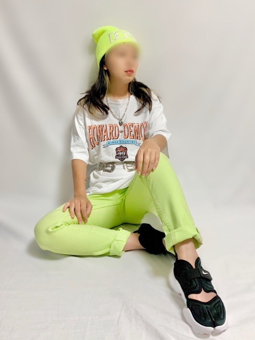 ご覧いただきありがとうございます😉 タグにあわせてネオンカラーコーデ🤩 _________________________________________ ❤️Tシャツ: @shaggie_official 🧡パンツ: @rodeocrowns_official 💜スニーカー: @nike 💙ニット帽: DOPE 🤎ネックレス: @bershka 💛ベルト: @whoswhogallery__