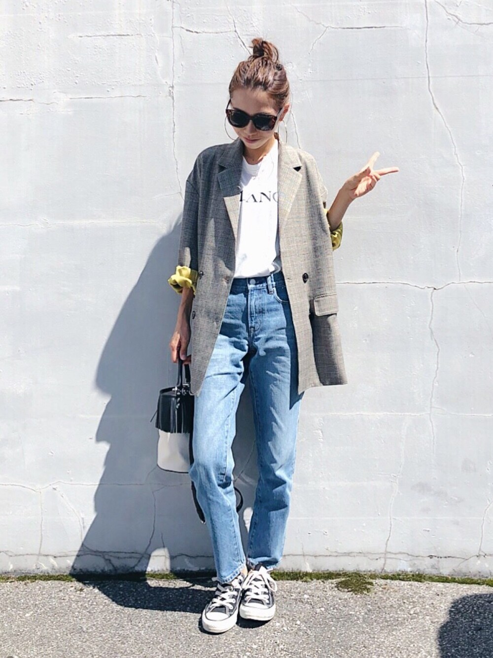yurieのテーラードジャケット「<高橋愛さんコラボ>ラブ&ピースプロジェクト 裏地配色がかわいいチェック柄のダブルボタンジャケット」を使ったコーディネート