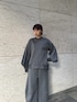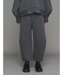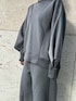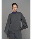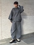 【TOP】ダブルタックデザインをほどよく張りのある段ボール素材で作ったトップスです。スウェットはカジュアルになる印象ですが、袖がバルーンでリブなども付いているので、メリハリのあるデザインになっています。ゆったりとしたリラックスできる着用感です。 【BOTTOM】ほどよく張りのある段ボール素材を使ったコクーンパンツです。ウェストは伸縮性のあるゴムになっています。コクーンの構築的なフォルムを変形ウェーブの切り替えで作っています。