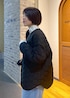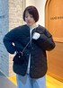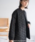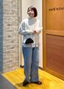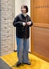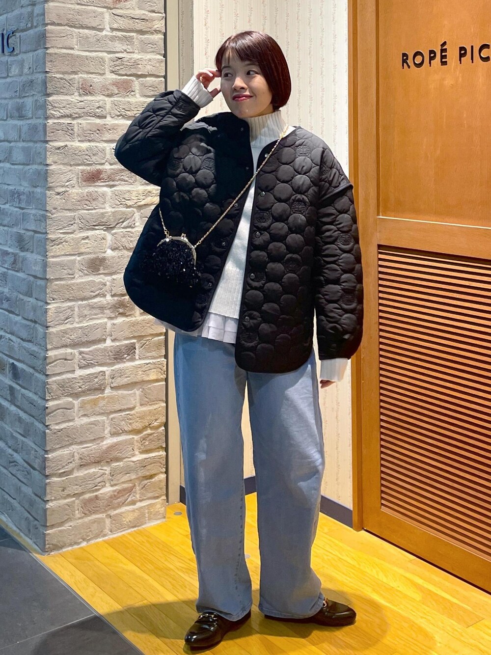 ドラえもんがひっそりと隠れているキルティングの柄が可愛いブルゾンに、デニムを合わせた休日にぴったりのカジュアルコーデです! ブルゾンのインナーには白のハイネックニットを合わせて程良くきれい見えしつつリラックス感あるスタイルに◎
