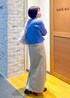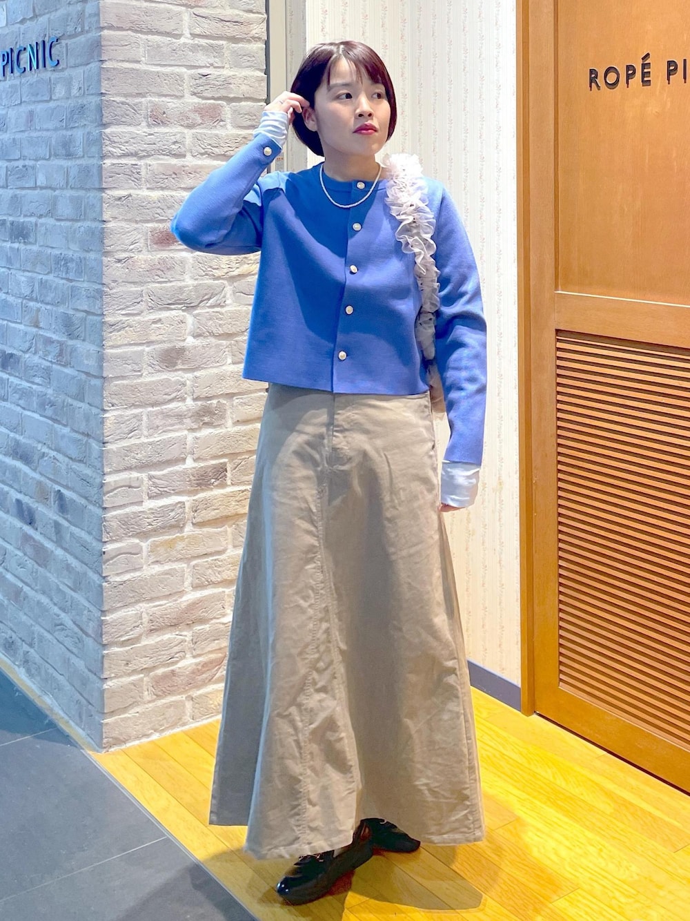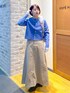 鮮やかなブルーが春っぽい金釦のカーディガンに、コーデュロイのスカートを合わせて、カジュアルだけどきれいさもあるスタイルです! コーデュロイのスカートは少しハリがありボリュームは出やすいのですが、すっきりした金釦のカーディガンを合わせれば、メリハリもあり大人っぽいスタイルに◎