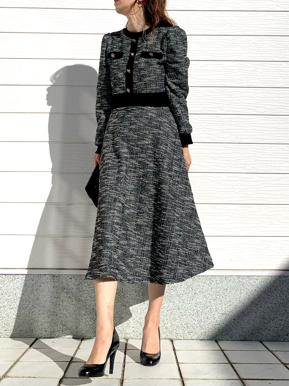 yuri(Q manager)のワンピース「ツイードフレアワンピース」を使ったコーディネート