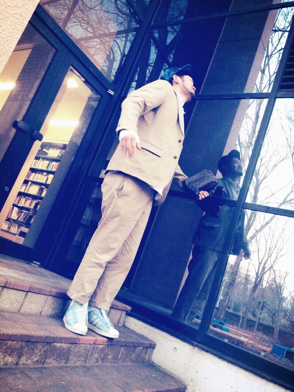 寒さからかこんなポーズに。_| ̄|○ 鏡越しに満面の笑みね。笑 角度的に見えませんがシャツを2枚重ねて着てます。あとスニーカーの紐、抜いてみました。笑 ピックアップタグの白ソックスでキマリ♫