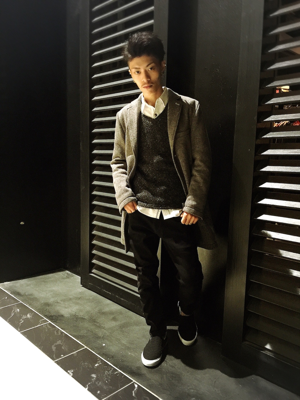 今回はチェスターコートを使ってみました! インナーにはシャツとニットソーをレイヤードし、すごく暖かみのあるコーデとなっております! シューズもボア付きのスリッポンなので、上から下まで暖かいです! これからもっと寒くなってきますので皆さん風邪には気をつけましょう(^_^)v 因みに僕は若干風邪気味です_| ̄|○笑