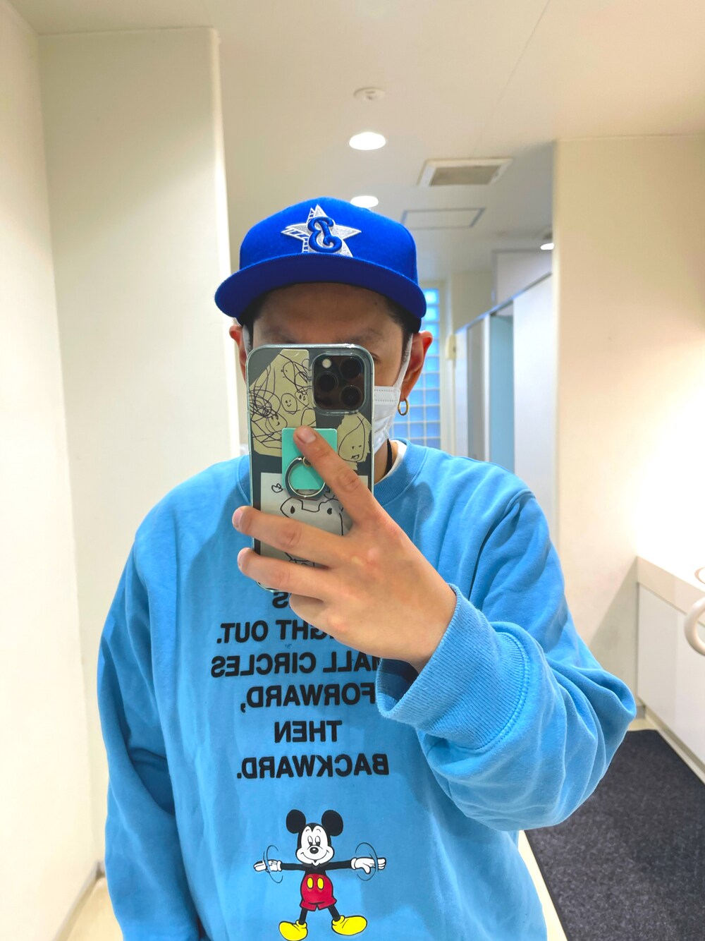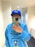 ブルー系のスウェット、ブルー系のデニムパンツ、ブルー系のキャップを着用したメンズの春コーディネートの1枚目の写真