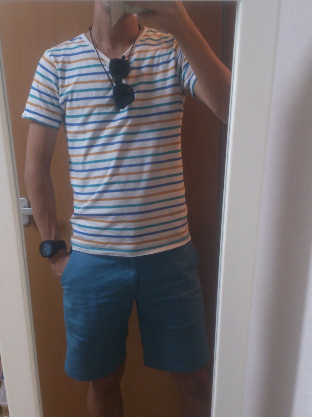 大阪難波のshot bar LINQ で久しぶりに飲みー♪ 夜中まで飲んで、お客さんいなくなれば、シャッター閉めてbarで寝てー(^^) そんなコーディネート!!! クマさんマークがお馴染みのCoenの短パン♪ 初めて水色のパンツに挑戦!! 似合ってるのかな、、、。 シャツはポケはお休みにして、ボーダーのシャツに(^.^) この色合い結構お気に入り♪ 気になったらコメント、セーブよろしくお願いします! またフォローしてくださーい。