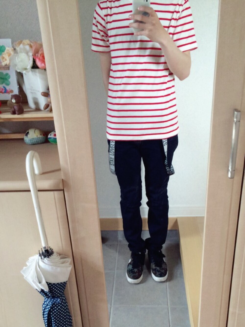 サスペンダーを入れたコーデ。 ボーダートップス。 ロゴいりサスペンダー。