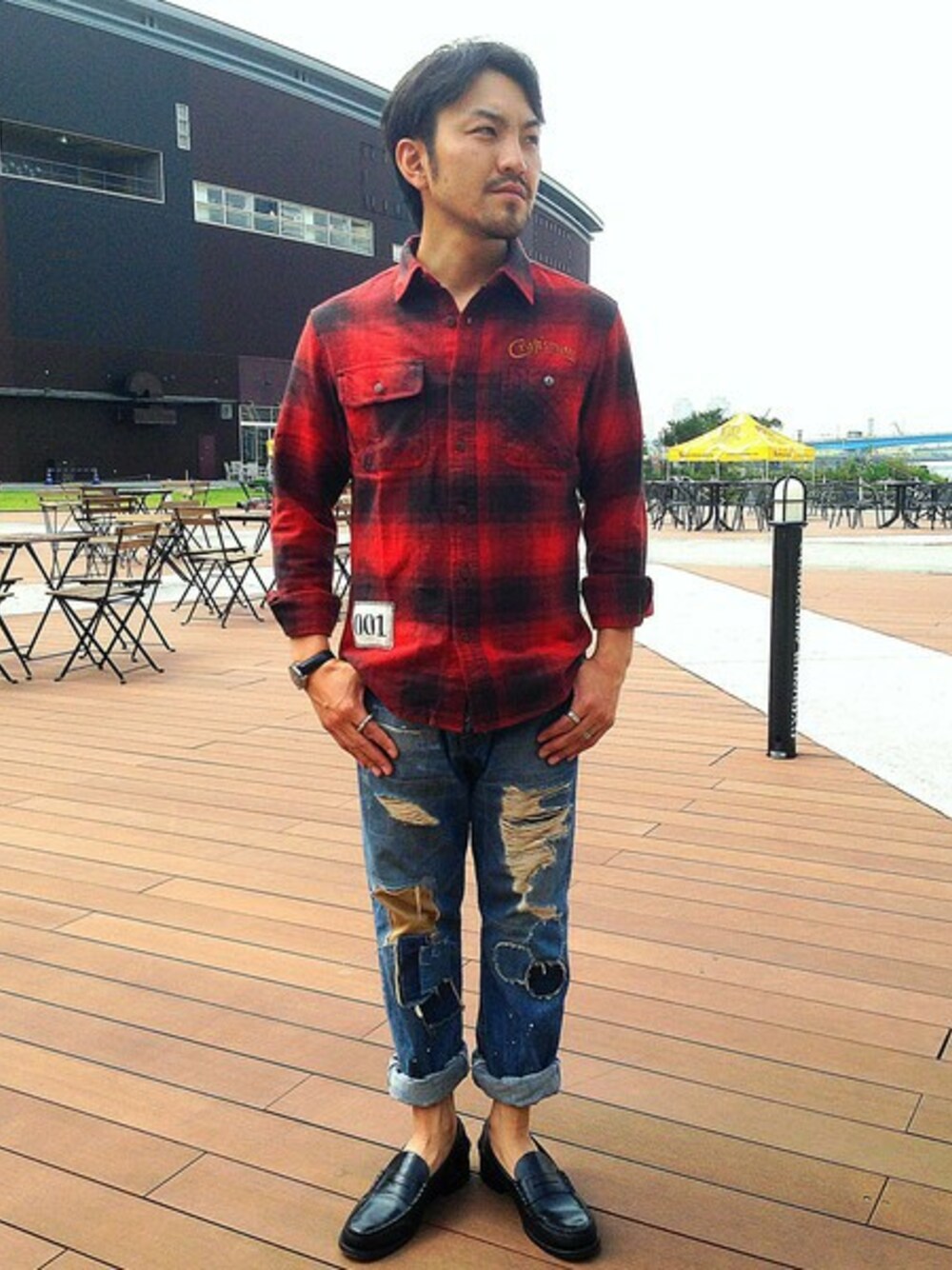 Y.ushiyamaのデニムパンツ「AVIREX(アヴィレックス)メンズ 「TYPE BLUE(タイプブルー)」 サージャント【CHUCK】 レギュラーフィット リメイク 」を使ったコーディネート