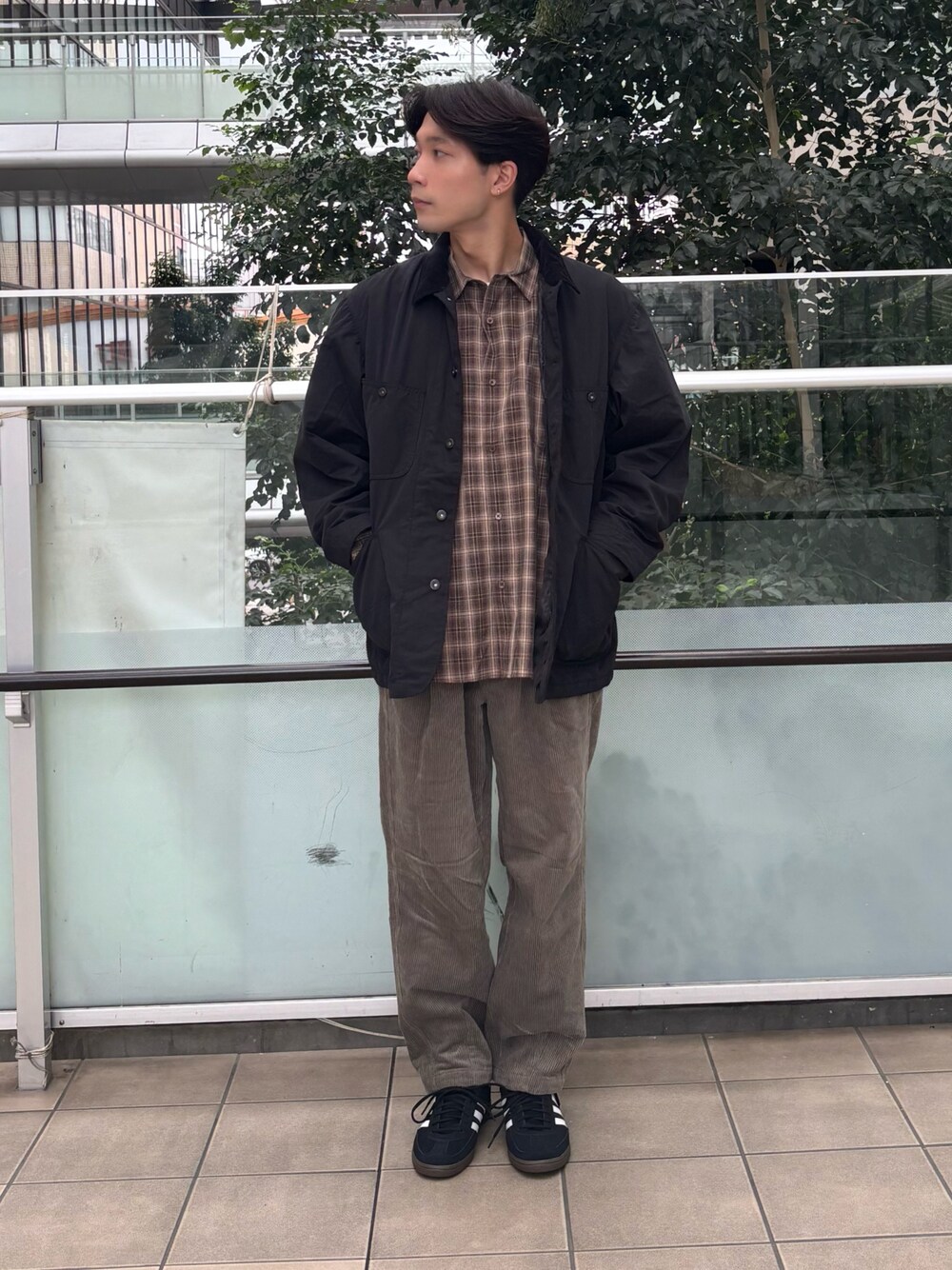 ご覧いただきありがとうございます。 ブラックとブラウンでまとめたコーディネートを組みました。 全体的にカジュアルなコーディネートですが インナーをシャツにしたり色味をまとめることで、キレイめ感も演出しています。